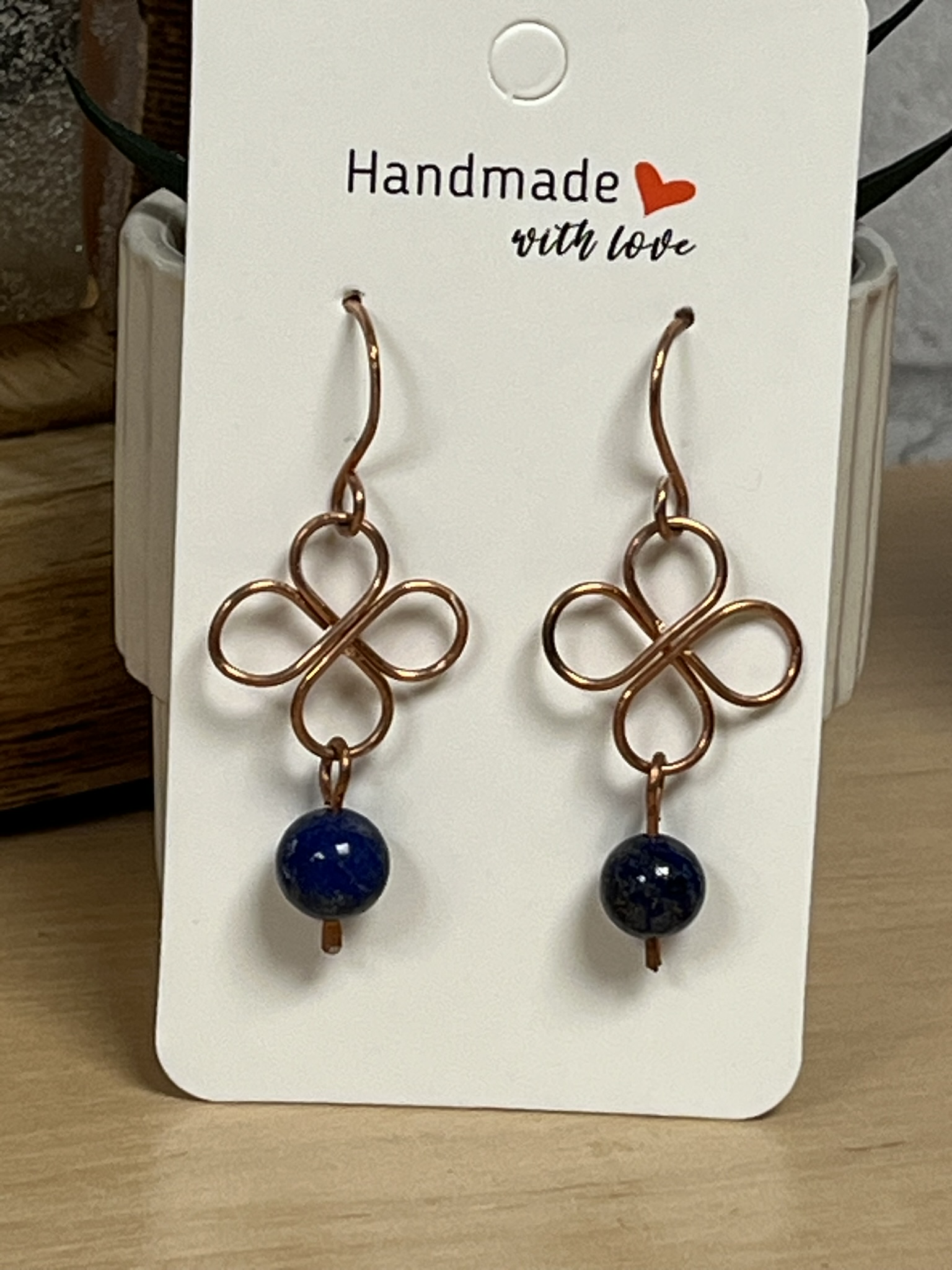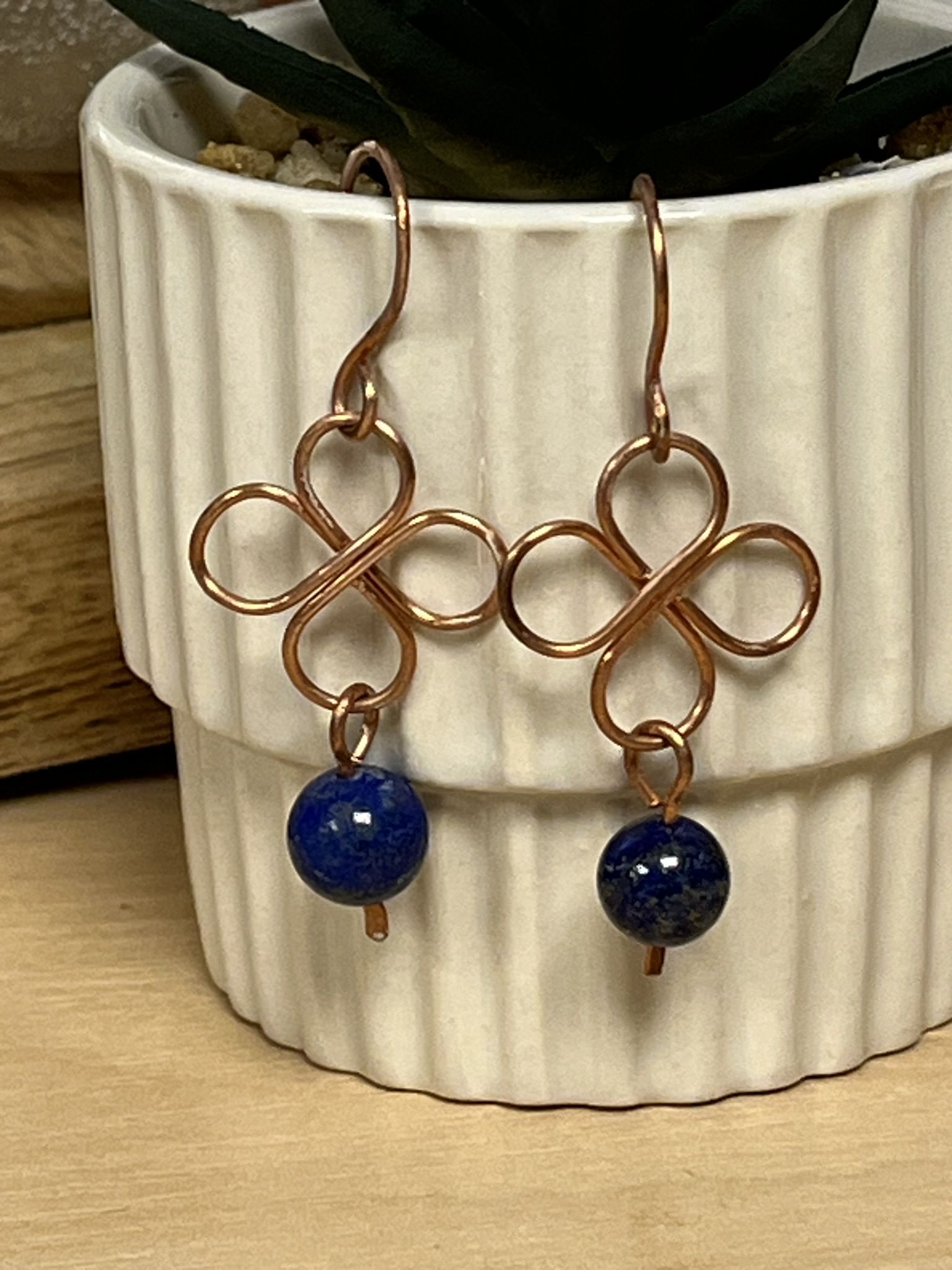 Magnifiques boucles d’oreilles en cuivre, réalisées artisanalement avec des pierres naturelles en lapis lazuli.