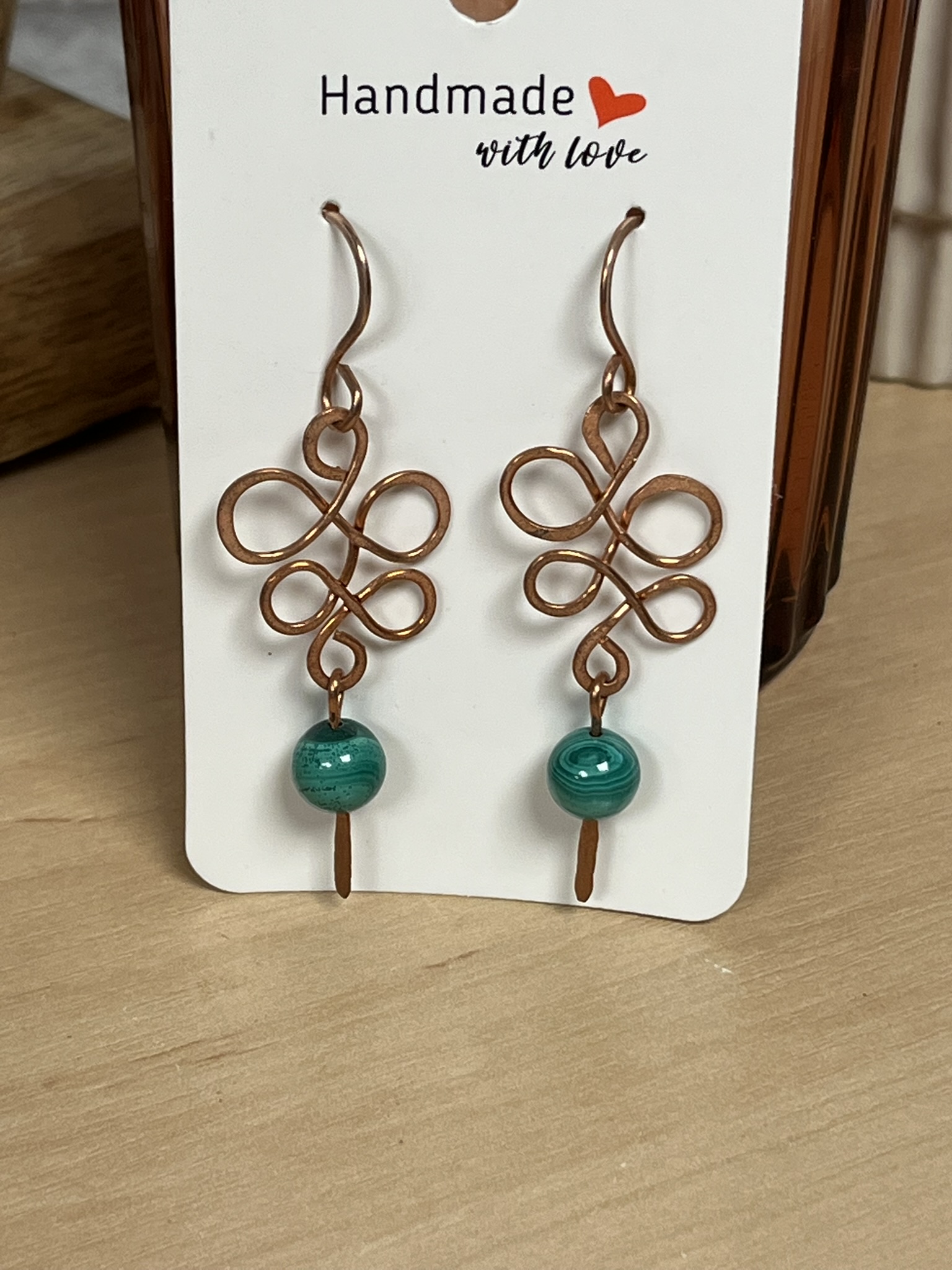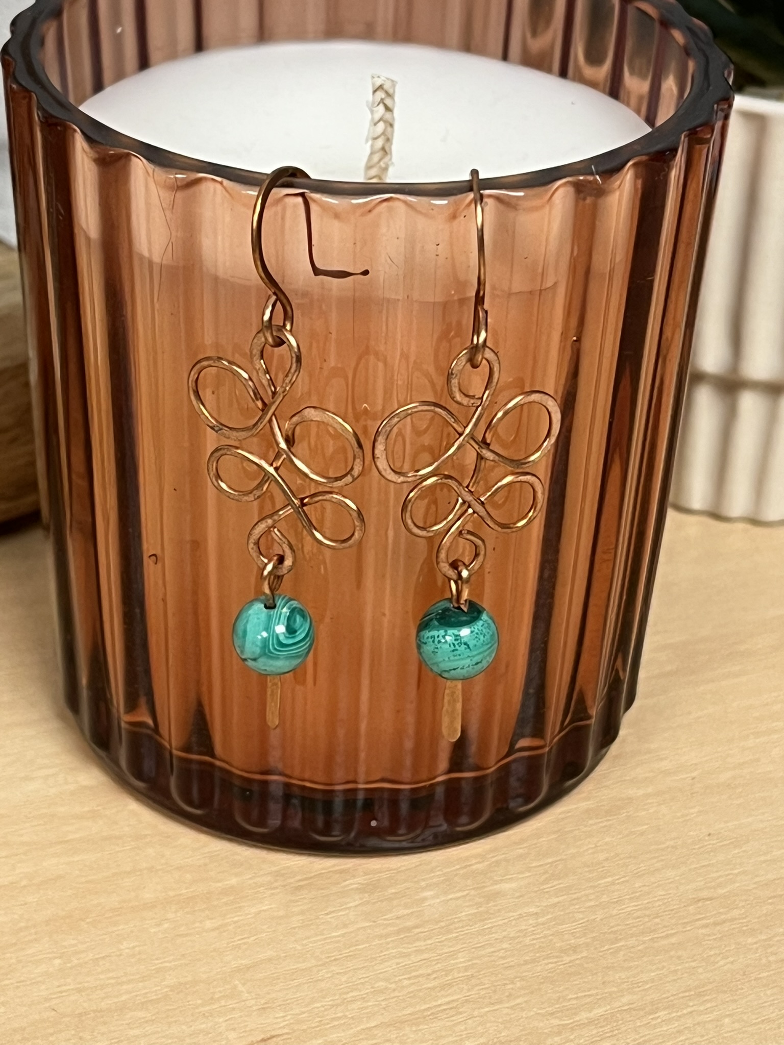 Magnifiques boucles d’oreilles en cuivre martelé, réalisées artisanalement avec des pierres naturelles en malachite.