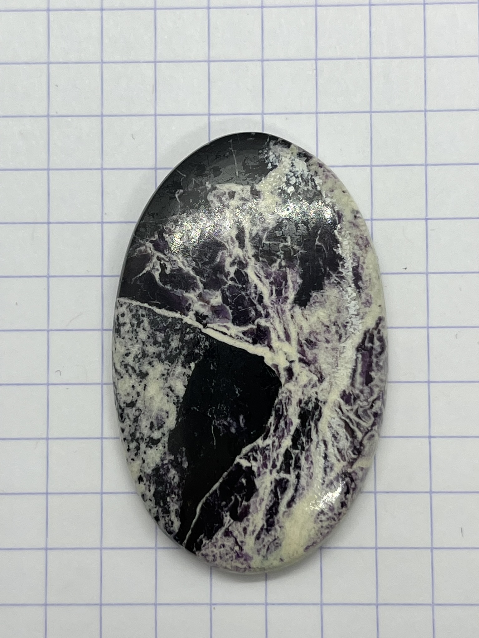 Sur la photographie quadrillée, chaque carreau mesure 0,5 cm × 0,5 cm, ce qui permet d’apprécier les dimensions de la pierre.